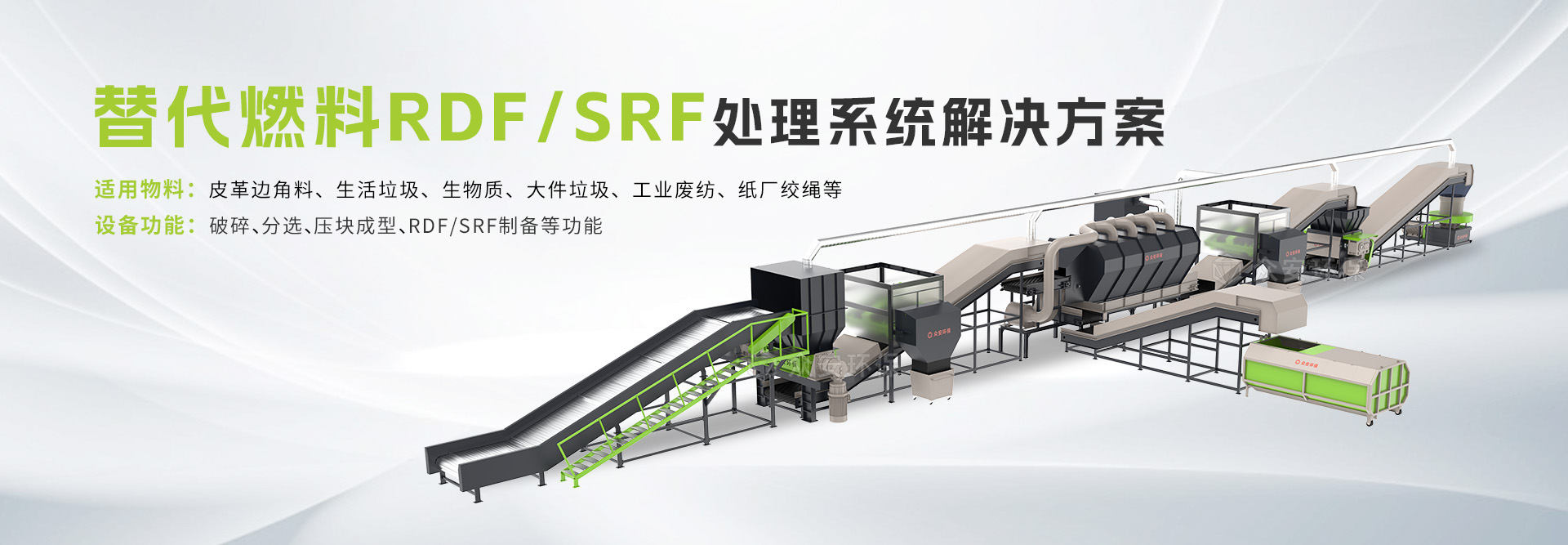 替代燃料RDF/SRF处理系统是针对工业垃圾、混合生活垃圾、装修垃圾的综合处置与回收利用的设备生产线,由输送机、破碎机、磁选设备、风选设备、成型设备、降尘设备等组成。该系统对可燃物垃圾由大到小、由混合到分类的资源化处置,实现垃圾资源化利用、提高城市环境卫生水平,有利于打造无废城市和建设循环经济,优化人居环境。